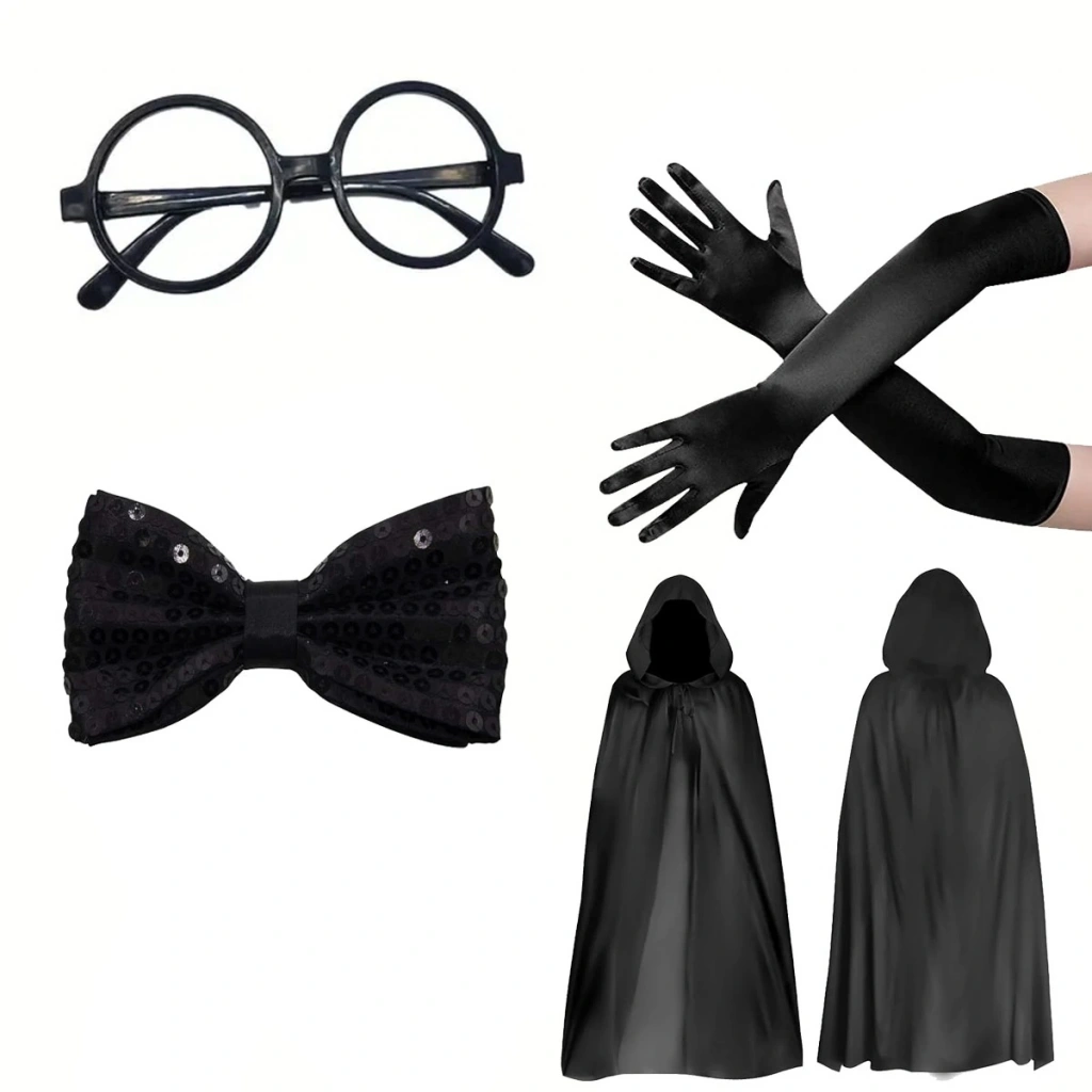 Cadı ve Büyücü Kostüm Seti 120 cm Siyah Kapüşonlu + Gözlük + Papyon + Uzun Eldiven